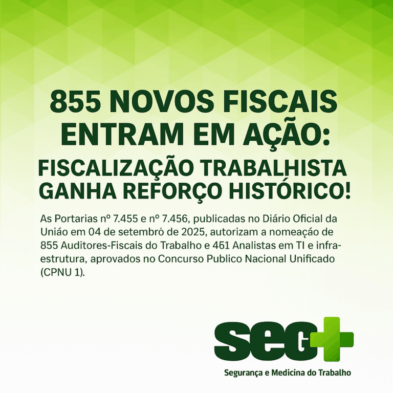 No dia 04 de setembro de 2025, foram publicadas no Diário Oficial da União as Portarias nº 7.455 e nº 7.456, que autorizam a nomeação de 855 Auditores-Fiscais do Trabalho